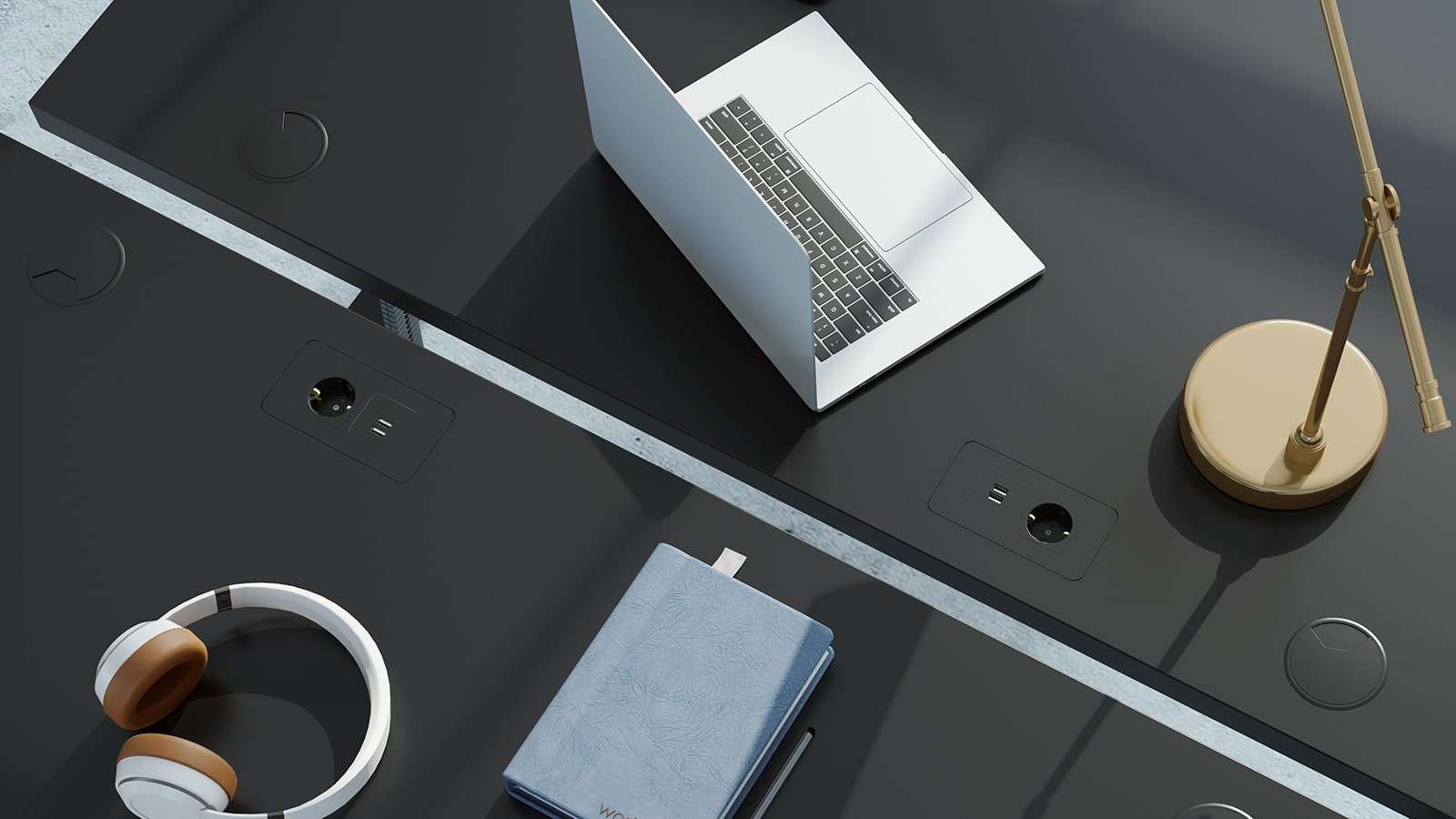 Das innovative Cabletop®-Konzept verbirgt sämtliche Kabel elegant in der Tischplatte. An Bord sind eine integrierte Schukosteckdose und zwei USB-Ports – für Direktladung von Laptop und Mobilgeräten, ganz ohne Kabelsalat.