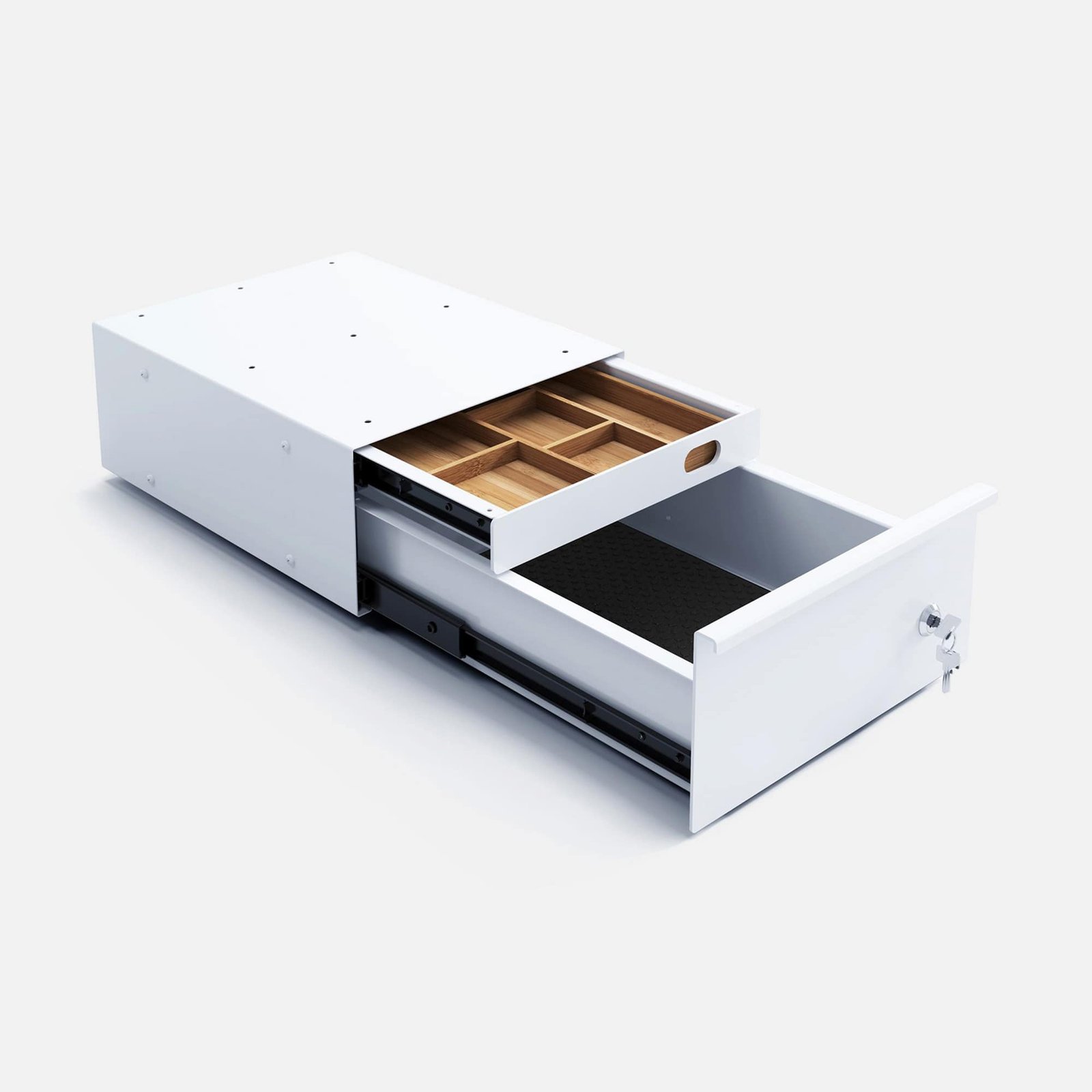 Erleben Sie einen aufgeräumten, sicheren und effizienten Arbeitsplatz mit der abschließbaren Metall-Schublade DUO GRIP inklusive nachhaltigem Bambus-Inlay (Montage nur rechts oder links)!
