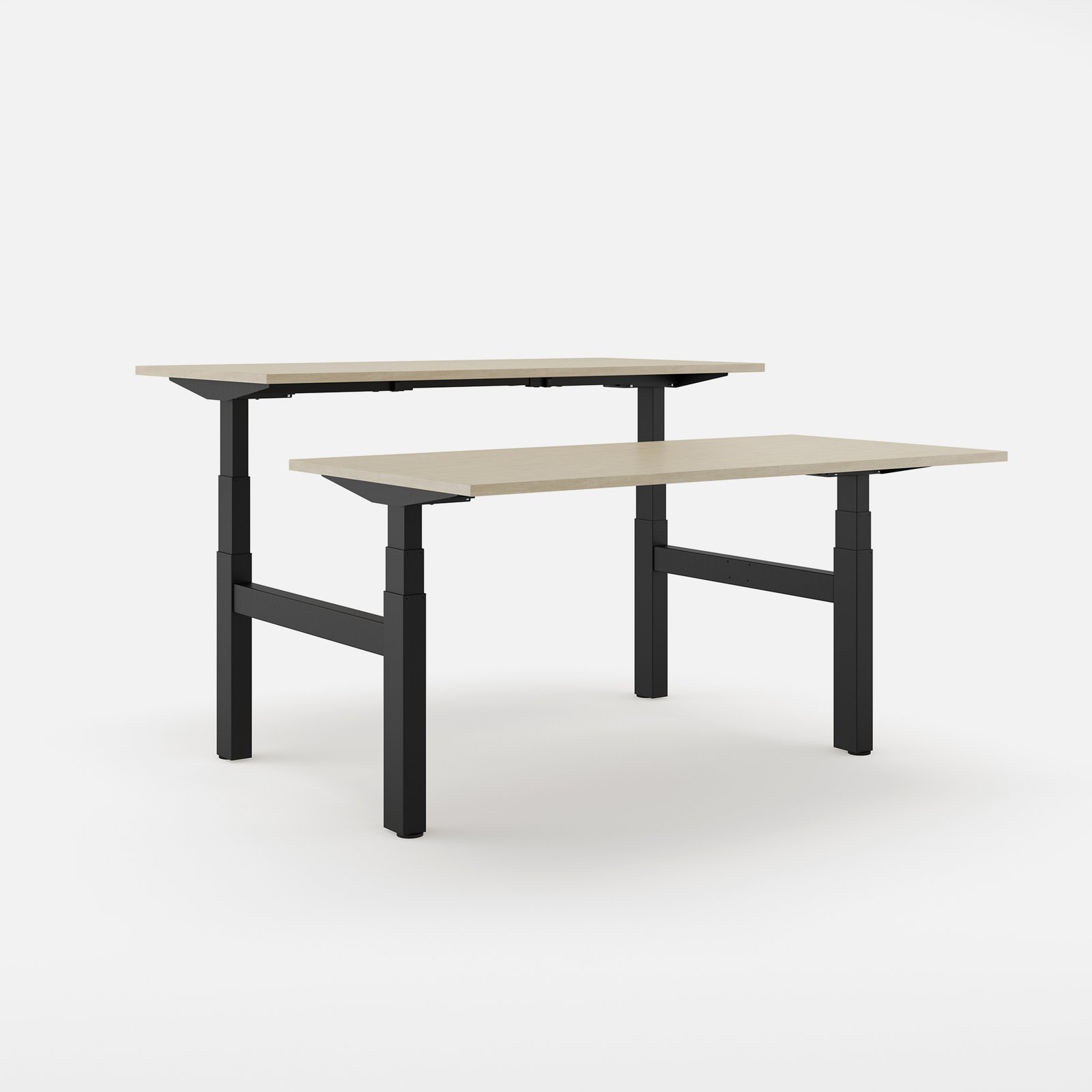 • Höhenverstellung: Betätige den Verstellmechanismus (motorisiert) kontrolliert und ohne Gewalt. Achte während der Verstellung darauf, dass sich keine Hindernisse oder Körperteile im Bewegungsbereich der Säulen und der Mechanik befinden, um Quetschungen oder Beschädigungen zu vermeiden. Bei Bench-Systemen mit synchronisierter Höhenverstellung ist besondere Aufmerksamkeit auf den Bereich zwischen den Arbeitsplätzen zu legen.